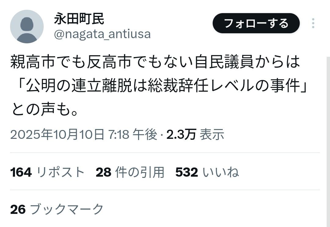 - 公明が抜けて騒ぐような連中は、始めから反高市だろ、嘘の記事を出すな。