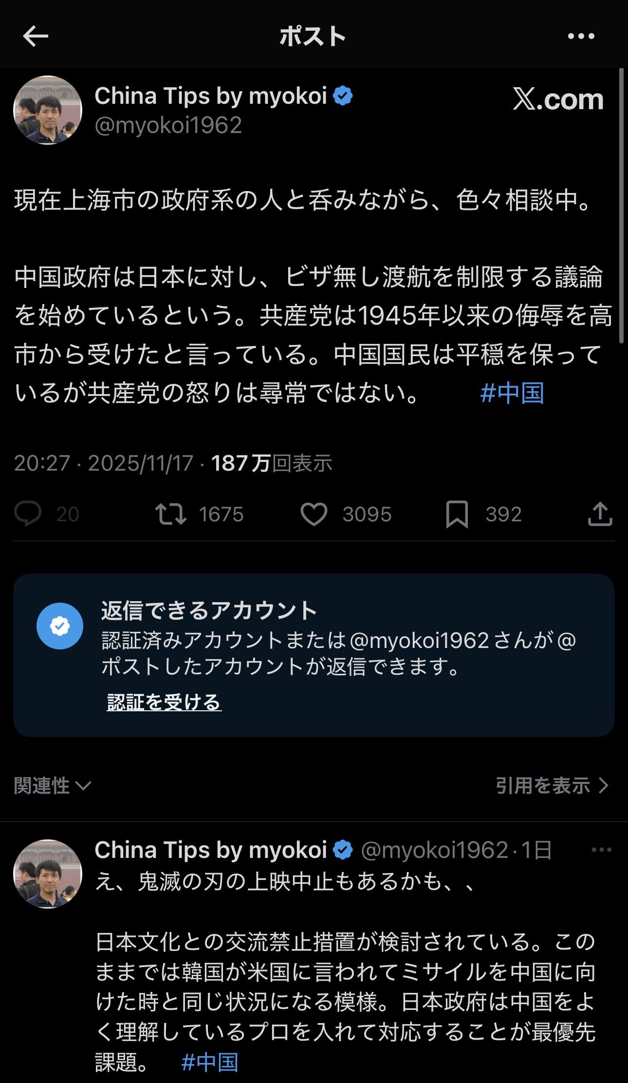 - 中国政府は高市早苗を首にしろと日本政府に要求してるのだが高市が謝れば解決するなのだ、中国の内政問題に口出しするからこうなるのだと思う、