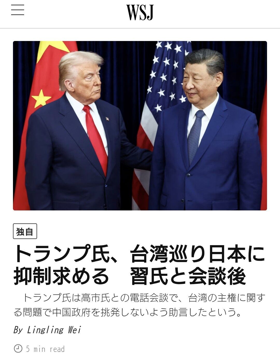高市首相の発言が一線を超えた事がミスで、日本が問題を作った原因、そして、トランプがそれを注意したという海外の記事は。完全に中国支援のプロパガンダニュースである・中国寄りなマスコミは世界に沢山ある・中国資本も入っていたり・・親中の記者も沢山いる。。。今回の記事は中国に責任は無く、日本が相手に対しての配慮が無かったと、日本悪を印象付ける狙いがあったのであろう・・米中会談の真実はロシアやイスラエル問題がある中で、これ以上の戦争を避ける目的で、中国が台湾にに武力行使したらアメリカも黙っていないと、トランプが、くぎを刺したのであろう。中国は第二次大戦でアメリカに助けてもらった事を引き合いに出し、アメリカを利用したかったようだが何の原質も引き出せずに失敗した・・戦時中アメリカは日本牽制の為に中国を利用を利用したに過ぎず中国を助けた訳では無い。逆に5年後に始まった朝鮮戦争では中国と戦争している。原爆も使おうとしていた。アメリカが自由民主主義の同盟国日本より、共産国の中国を応援する訳が無い。日本にとっては高市外交の成果ともいえる・・・