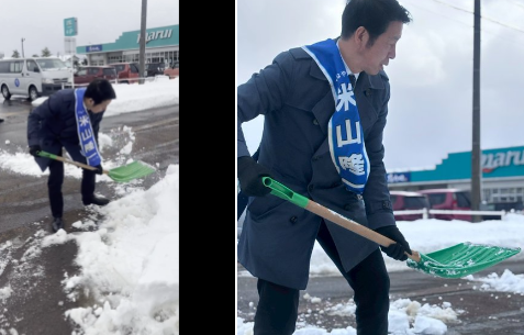 ・米山隆一氏は1月28日、マルイ中之島店での街頭演説前に除雪を行ったとX(旧Twitter)で投稿した。
