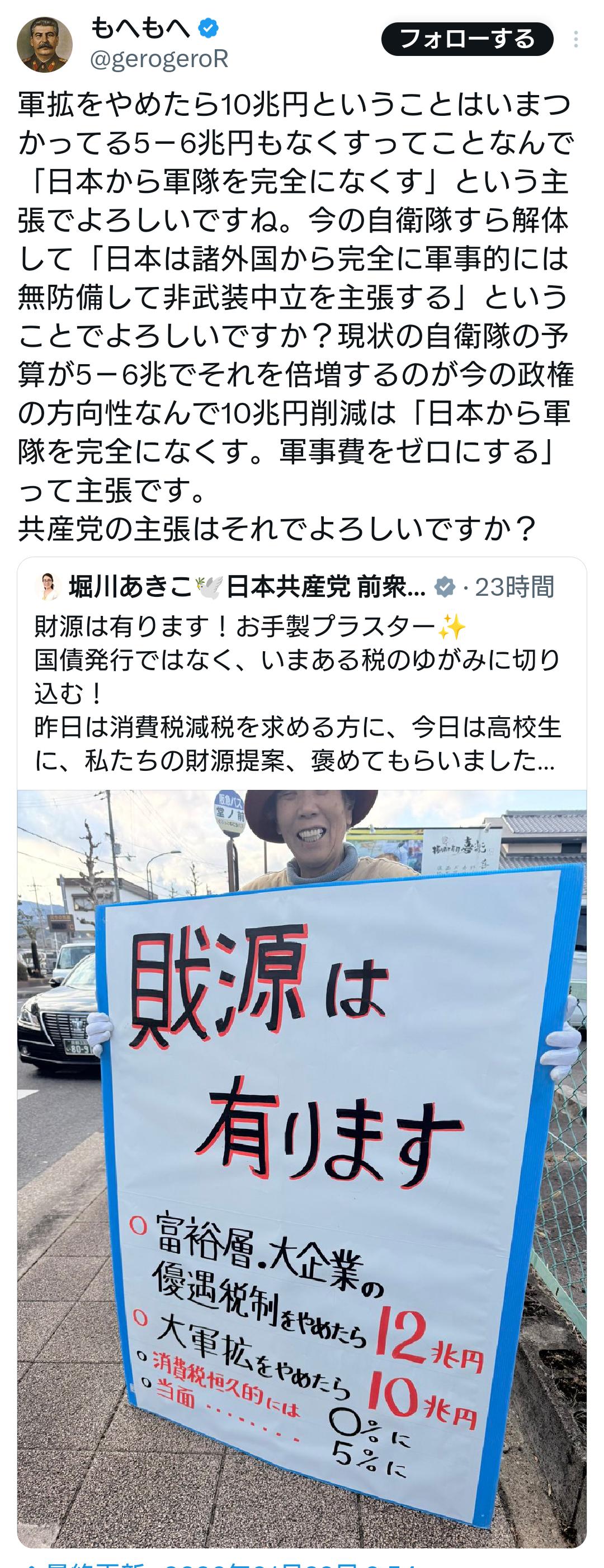 軍拡をやめたら10兆円ということはいまつかってる5-6兆円もなくすってことなんで「日本から軍隊を完全になくす」という主張でよろしいですね。今の自衛隊すら解体して「日本は諸外国から完全に軍事的には無防備して非武装中立を主張する」ということでよろしいですか?現状の自衛隊の予算が5-6兆でそ… https://t.co/mmMTUiDKci