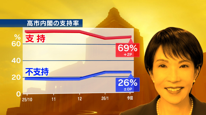 テレビ東京と日本経済新聞社の2月世論調査では、高市内閣の支持率は69%で前月から2ポイント上昇、不支持は26%で横ばいだった。