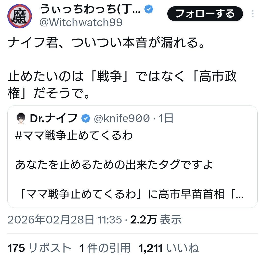 発端は、Dr.ナイフ氏が「#ママ戦争止めてくるわ」と投稿し、それに対して高市早苗首相が「思いは同じ」と応じたとされる一連のやり取りだ。