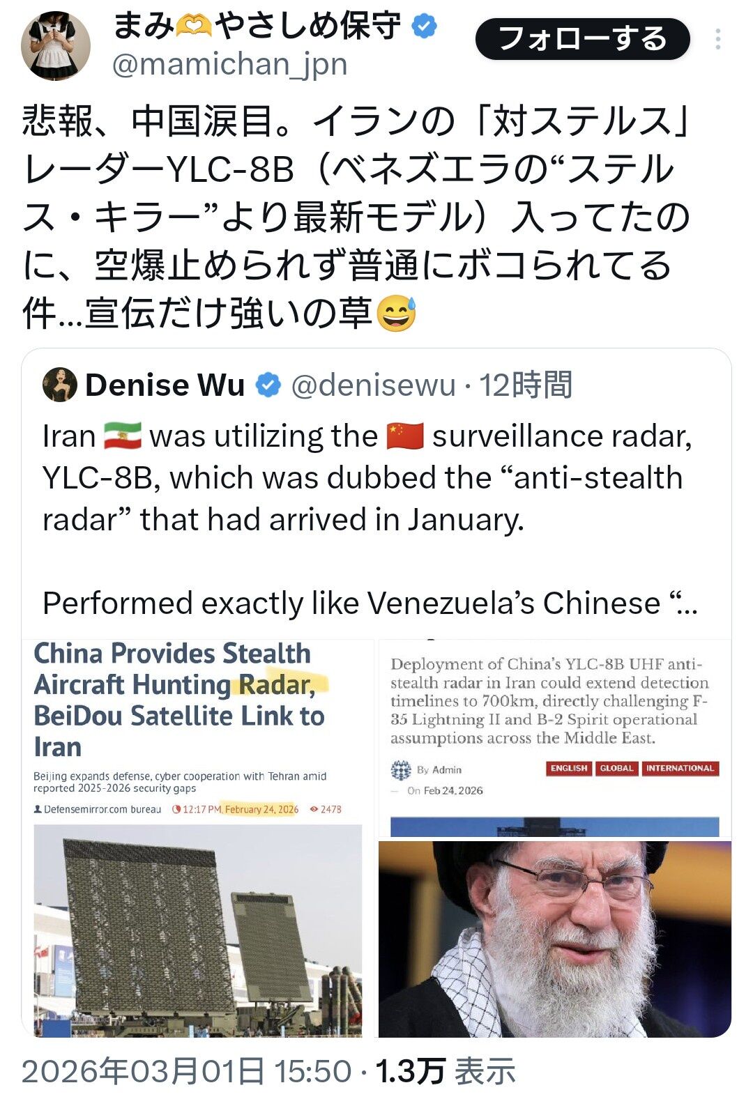 発端は、X(旧Twitter)上の投稿で「イランに中国製の対ステルス・レーダーYLC-8B(最新モデル)が入っていたのに、空爆を止められなかった」とする内容が共有されたこと。
