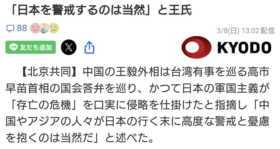 共同通信配信の記事によると、王氏は高市早苗首相の国会答弁を巡り、かつて日本の軍国主義が「存亡の危機」を口実に侵略を仕掛けたと指摘した。